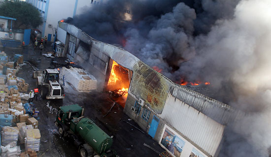A blaze rages at a United Nations run warehouse after it was shelled by Israeli forces in Gaza City, on Thursday, Jan. 15, 2009. Israeli armed forces struck the headquarters of a United Nations relief agency and moved deeper into Gaza City as UN Secretary-General Ban Ki-moon arrived in Israel on a Middle East shuttle mission to secure a cease-fire. Photographer: Khaled Hasan/Bloomberg News